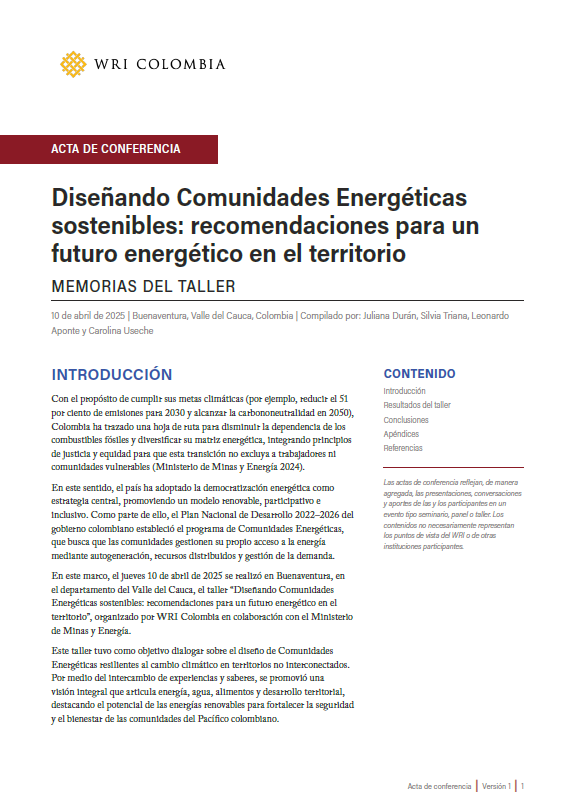 Esta Acta de Conferencia presenta los resultados del taller “Diseñando Comunidades Energéticas sostenibles: recomendaciones para un futuro energético en el territorio”, organizado por WRI Colombia en colaboración con el Ministerio de Minas y Energía. El encuentro reunió actores gubernamentales y comunitarios en Buenaventura para dialogar sobre el diseño de Comunidades Energéticas resilientes al cambio climático en territorios no interconectados, promoviendo una transición energética justa, inclusiva y sostenible para Colombia.