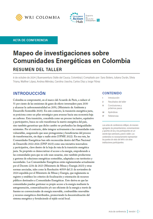 Esta Acta de conferencia presenta los resultados del taller “Mapeo de la investigación relacionada con las Comunidades Energéticas en Colombia”, organizado por WRI Colombia, para identificar los temas que abordan estas investigaciones, así como los retos y oportunidades para potenciar la investigación vinculada a la implementación de Comunidades Energéticas en Colombia. Con este documento, se brinda una visión sistematizada que facilita la identificación de tendencias, vacíos temáticos y oportunidades de articulación entre actores relevantes del entorno.