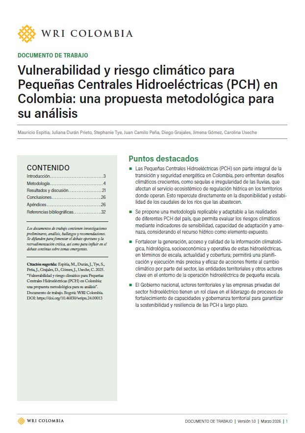 Las pequeñas centrales hidroeléctricas (PCH) son clave para la transición energética de Colombia, pero enfrentan riesgos por la variabilidad climática que afecta el recurso hídrico. Este estudio propone una metodología flexible y replicable para evaluar su vulnerabilidad y riesgo climático, fortaleciendo la planificación, la gestión y la resiliencia del sector.